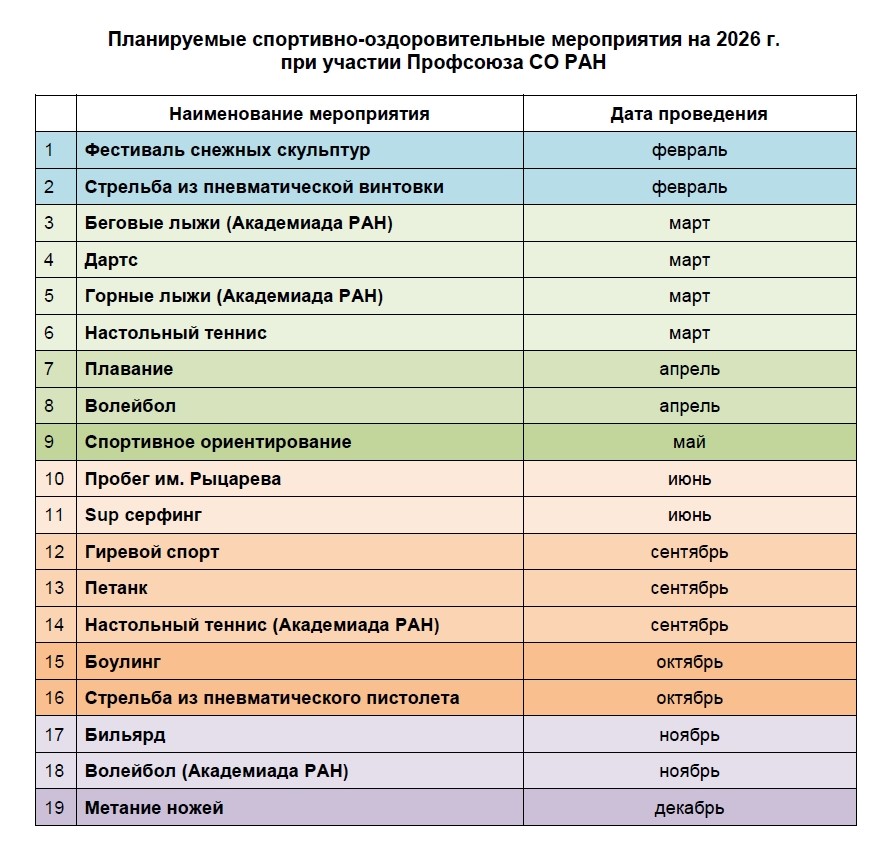 Профсоюз СО РАН приглашает принять участие в спортивно-оздоровительных мероприятиях в 2026 году (см. график мероприятий).