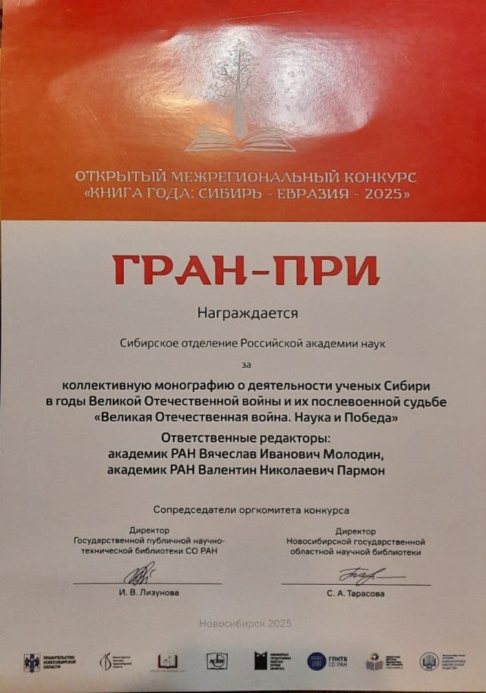 Книга «Великая Отечественная война. Наука и Победа. Коллективная монография / К.В. Абрамова, А.О. Анисимов, Е.Г. Багрянская [и др.]; отв. ред.: В.И. Молодин, В.Н. Пармон. Новосибирск: СО РАН, 2025. 354 с.» стала победителем в номинации «Лучшее издание, посвященное 80-летию Великой Победы» на Открытом межрегиональном конкурсе «Книга года: Сибирь – Евразия –2025».