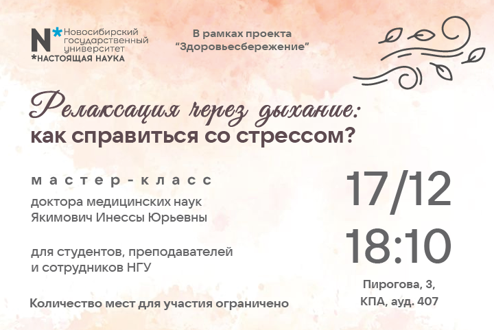 Для сотрудников НГУ и/или преподавателей в рамках проекта «Здоровьесбережение» 17 декабря на базе НГУ состоится практический тренинг «Релаксация через дыхание: как справиться с экзаменационным/рабочим стрессом» профессора кафедры клинического моделирования здоровья и персонализированной медицины ИММТ, доктора медицинских наук Якимович Инессы Юрьевны.