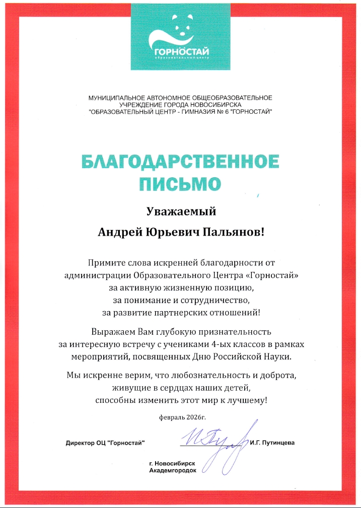 В адрес ИСИ СО РАН поступило благодарственное письмо от директора ОЦ "Горностай" И.Г. Путинцевой.